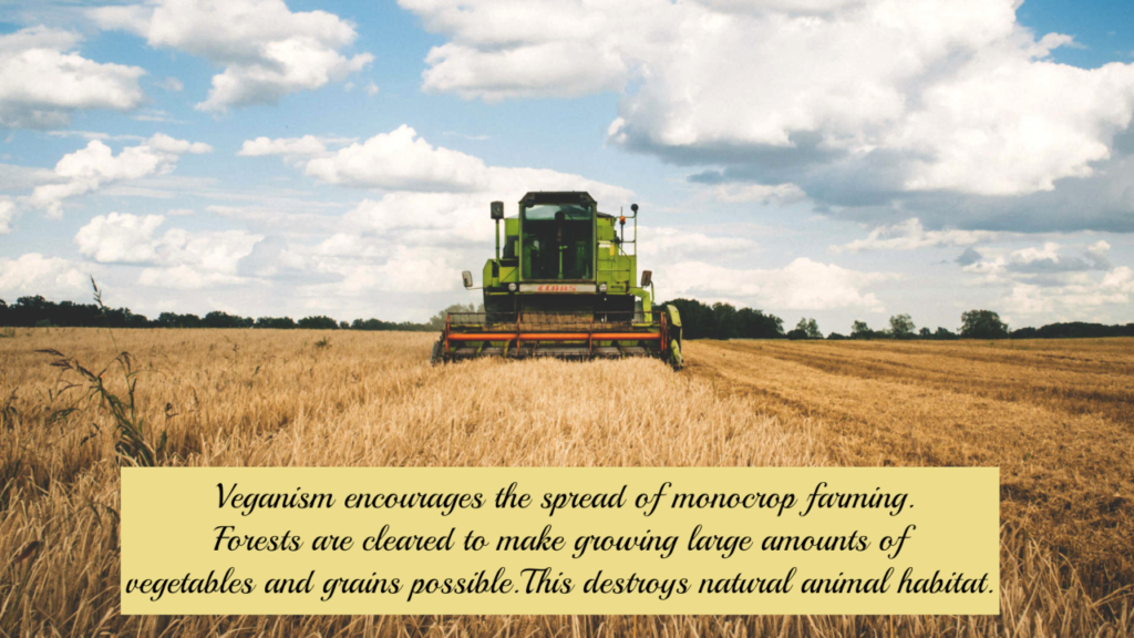 Veganism encourages monocrop farming as only the richest can afford buying locally grown organic vegetables and grains. The more people become vegans, the more this practice will spread; and when vast fields growing the single kind of grain or vegetable are mechanically reaped, animals such as rabbits and mice are killed as a result of this process.